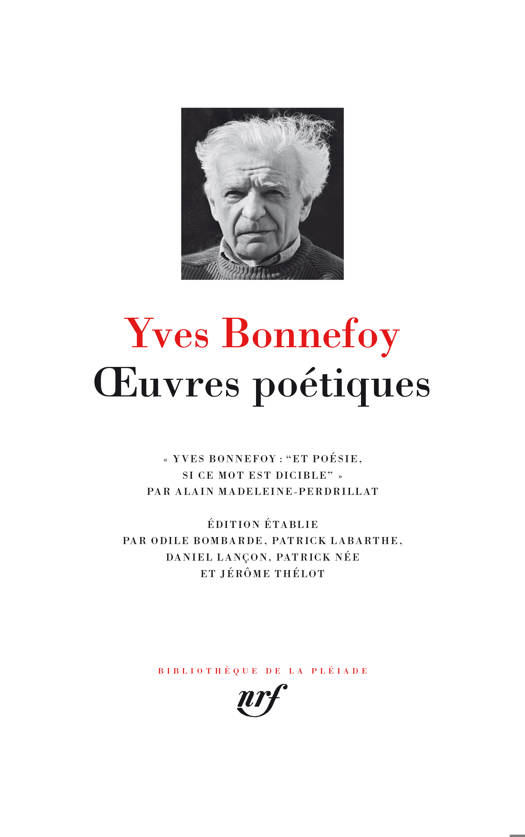 Les derniers livres d'Yves Bonnefoy (1923-2016) expriment son désir de transmettre le legs de la poésie par-delà la mort. "Lègue-nous de ne pas mourir désespéré", lit-on dans L'heure présente (2011). Quant à L'Écharpe rouge (2016), c'est un "livre de famille" testamentaire en même temps que l'histoire d'une vocation : "Il se trouve que j'étais apte à me vouer à l'emploi disons poétique de la parole..." La Pléiade fut pour Bonnefoy l'occasion de porter sur son oeuvre un regard ordonnateur. Il choisit le titre du volume, Œuvres poétiques, sans céder sur son désir de faire figurer au sommaire quelques textes brefs que l'on qualifierait spontanément d'essais. Le plan serait chronologique. Alors que certaines éditions antérieures associaient des livres ou des recueils relevant de temporalités différentes, il a défait ces "recueils de recueils" pour revenir au plus près des dates des éditions originales. Le grand recueil de 1987, par exemple, Récits en rêve, a éclaté, sans que se perde l'expression récits en rêve, qui désigne chez Bonnefoy une inspiration essentielle ; elle apparaît désormais en sous-titre de certains livres. Tous les livres ou recueils poétiques, vers, prose, ou vers et prose, sont présents. Bonnefoy ne se reniait pas ; il a souhaité donner dans les appendices quelques textes rares, bien qu'ils soient désormais loin de lui. Il a voulu aussi que soit présente son oeuvre de traducteur, de Shakespeare à Yeats, de Pétrarque à Leopardi. Enfin il a ouvert à ses éditeurs les portes de son atelier. Ses manuscrits ont pu être consultés. Ils sont utilisés En marge des oeuvres, où l'on trouvera quelques textes et fragments inédits.