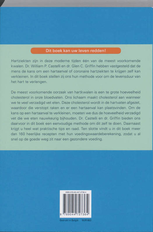 Dit boek kan uw leven redden! Hartziekten zijn in deze moderne tijden één van de meest voorkomende kwalen. Dr. William P. Castelli en dr. Glen C. Griffin hebben vastgesteld dat de mens de kans om een hartaanval of coronaire hartziekten te krijgen zelf kan verkleinen. In dit boek stellen zij ons hun methode voor om de levensduur van het hart te verlengen. De meest voorkomende oorzaak van hartkwalen is een te grote hoeveelheid cholesterol in onze bloedvaten. Ons lichaam maakt cholesterol aan wanneer we te veel verzadigd vet eten. Deze cholesterol wordt in de hartvaten afgezet, waardoor die verstopt raken en er een hartaanval kan plaatsvinden. Om de kans op een hartaanval te verkleinen, moeten we dus de hoeveelheid verzadigd vet die we eten nauwkeurig bijhouden. Dr. Castelli en dr. Griffin bieden ons daarvoor in dit boek een eenvoudige methode om dit zelf te doen. Daarnaast krijgt u heel wat praktische tips en raad. Ten slotte vindt u in dit boek meer dan 160 heerlijke recepten met hun voedingswaardeberekening, zodat u al snel op de goede weg zit naar een gezondere voeding.