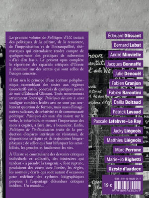 À Uzeste, village de 400 habitants où vit et sévit Bernard Lubat, s'invente, depuis plusieurs décennies, les bases d'un commun rural critique. Par les arts, les mots ou encore l'improvisation, toujours mis en relation avec l'histoire sociale et politique régionale, les Uzestois.es ont su créer un front culturel de résistance populaire unique en son genre. Uzeste, Politiques d'UZ tome 2 - Critique en étendue rassemble des textes de nature très variée, écrits par une vingtaine de contributeurs (sociologues, musiciens, paysans, plasticiens, cafetière, comédiens, écrivains, militants, etc.) qui, partagent avec générosité leurs expériences uzestoises, dans des registres qui leurs sont propres.
