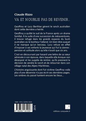 Geoffroy et Lucy Berthier gèrent le ranch australien dont cette dernière a hérité. Geoffroy a quitté le sud de la France après un drame familial. À la suite d’une succession de mésaventures, il trouve refuge dans les grands espaces du bush australien où le bonheur l’attend. Un bien-être auquel il ne manque qu’un berceau. Lucy refuse en effet d’imposer à ses enfants la jeunesse qui fut la sienne : pension et solitude alors qu’elle n’avait que six ans. C’est en découvrant par hasard une lettre de sa soeur adressée à son épouse, dans laquelle elle évoque son désespoir et les supplie de rentrer, qu’ils prennent la décision de vendre le ranch et de retourner dans son village natal des Alpes-Maritimes. L’histoire angoissante dont fut victime Geoffroy voilà plus d’une décennie n’a pas écrit ses dernières pages. Les ombres du passé hantent encore les lieux...