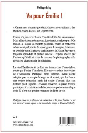 « On ne peut donner que deux choses à ses enfants : des racines et des ailes », dit le proverbe. Émilie n’a pas eu la chance d’en être dotée dès sa naissance. Mais elles étaient néanmoins, forcément, quelque part ! Ce roman, à l’allure d’enquête policière, relate sa recherche acharnée et palpitante de ses origines. L’intrigue, haletante, se déploie entre la région parisienne et la Haute Provence, toujours splendide et parfois cruelle – région adorée par l’auteur qu’il décrit avec la passion du photographe et la précision chirurgicale du clinicien. La vie d’Émilie aurait pu finir sur les marches d’une église, noyée par l’urine d’un chien. Elle survivra dans les crèches de l’Assistance Publique, alors infâmes, avant d’être adoptée par un couple bourgeois et secret, qui lui donne une solide éducation mais lui cache d’autant plus son histoire qu’il l’ignore. Devenue médecin, la jeune femme participera à la création du laboratoire de police scientifique de la PJ d’où elle pourra remonter le fil de sa vie. Philippe Lévy est professeur de médecine. « Va pour Émilie ! » est son second roman, après « Le transit des corps », Balland (2010).