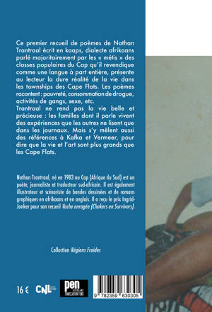 Ce premier recueil de poèmes de Nathan Trantraal écrit en kaaps, dialecte afrikaans parlé majoritairement par les "métis" des classes populaires du Cap qu’il revendique comme une langue à part entière, présente au lecteur la dure réalité de la vie dans les townships des Cape Flats. Les poèmes racontent : pauvreté, consommation de drogue, activités de gangs, sexe, etc. Trantraal ne rend pas la vie belle et précieuse : les familles dont il parle vivent des expériences que les autres ne lisent que dans les journaux. Mais s’y mêlent aussi des références à Kafka et Vermeer, pour dire que la vie et l’art sont plus grands que les Cape Flats.