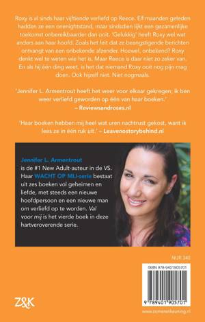 Val voor mij is het vierde boek in de Wacht op mij-serie van de Amerikaanse bestsellerauteur Jennifer L. Armentrout. Barvrouw Roxy en politieagent Reece hebben elf maanden geleden een onenightstand gehad die voor beiden niet was wat ze ervan verwachtten, maar voor ieder om een heel andere reden. Nu probeert Roxy hem te ontlopen terwijl Reece probeert tot haar door te dringen… en er probeert nog iemand anders tot Roxy door te dringen. Val voor mij is een sexy en spannend boek met heel veel vaart. New adult zoals het hoort te zijn. Fan geworden van Jennifer L. Armentrout? Goed nieuws: de Wacht op mij-serie telt in totaal zes boeken!