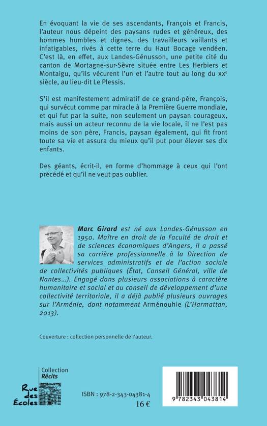 En évoquant la vie de ses ascendants, François et Francis, l'auteur nous dépeint des paysans rudes et généreux, des hommes humbles et dignes, des travailleurs vaillants et infatigables, rivés à cette terre du Haut Bocage vendéen. C'est là, en effet, aux Landes-Génusson, une petite cité du canton de Mortagne-sur-Sèvre située entre Les Herbiers et Montaigu, qu'ils vécurent l'un et l'autre tout au long du XXe siècle, au lieu-dit Le Plessis.