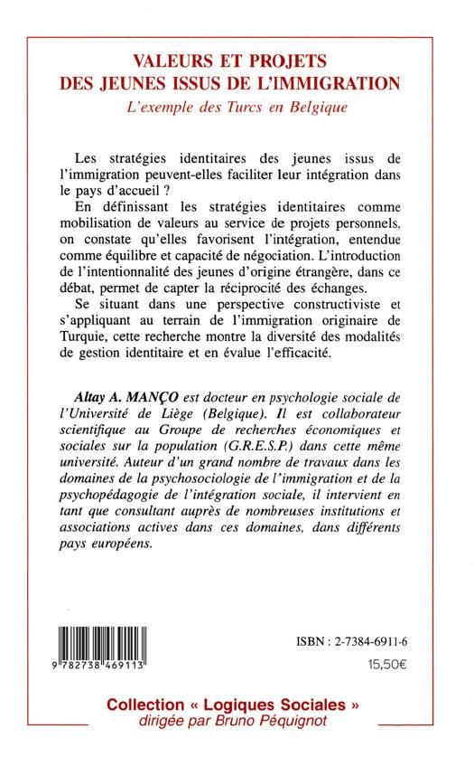 Les stratégies identitaires des jeunes issus de l'immigration peuvent-elles faciliter leur intégration dans le pays d'accueil ? En définissant les stratégies identitaires comme mobilisation de valeurs au service de projets personnels, on constate qu'elle favorisent l'intégration, entendue comme équilibre et capacité de négociation. L'introduction de l'intentionnalité des jeunes d'origine étrangère dans ce débat, permet de capter la réciprocité des échanges. Se situant dans une perspective constructiviste et s'appliquant au terrain de l'immigration originaire de Turquie, cette recherche montre la diversité des modalités de gestion identitaire et en évalue l'efficacité.
