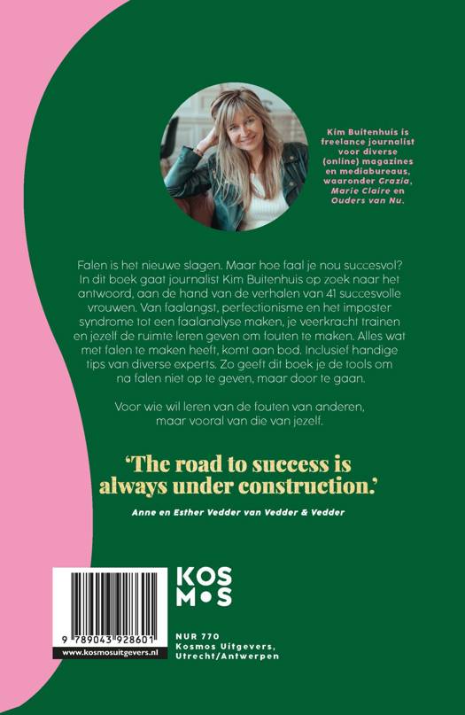 In haar boek ontdek je aan de hand van de verhalen van 41 inspirerende vrouwen uit diverse branches wat er aan veel successstories vooraf is gegaan, en dat waardevolle leermomenten hierbij onmisbaar zijn. Daarbij leer je dankzij de handige tips van diverse experts o.a. hoe om te gaan met zo’n beetje alle facetten die met falen te maken hebben. Denk aan faalangst, perfectionisme, spreekangst en wat er voor nodig is om fouten te durven maken. Dit boek geeft je de tools om na falen niet op te geven, maar door te gaan.
