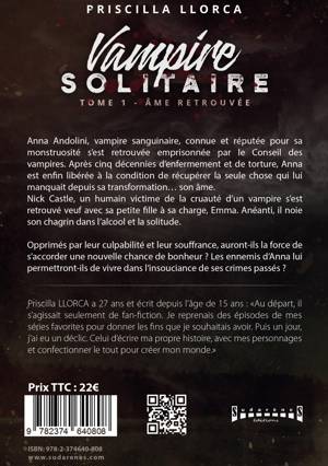 Elle est vampire, il est humain : leurs chemins ne devaient jamais se croiser... Anna Andolini, vampire sanguinaire, connue et réputée pour sa monstruosité s'est retrouvée emprisonnée par le Conseil des vampires. Après cinq décennies d'enfermement et de torture, Anna est enfin libérée à la condition de récupérer la seule chose qui lui manquait depuis sa transformation... son âme. Nick Castle, un humain victime de la cruauté d'un vampire s'est retrouvé veuf avec sa petite fille à sa charge, Emma. Anéanti, il noie son chagrin dans l'alcool et la solitude. Opprimés par leur culpabilité et leur souffrance, auront-ils la force de s'accorder une nouvelle chance de bonheur ? Les ennemis d'Anna lui permettront-ils de vivre dans l'insouciance de ses crimes passés ? Fantasy et romance sont au rendez-vous de ce premier tome envoûtant !