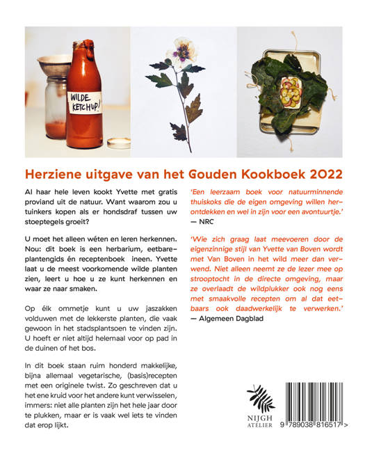 Een herbarium, eetbare plantengids én receptenboek ineen Al haar hele leven kookt Yvette met gratis proviand uit de natuur. Want waarom zou u tuinkers kopen als er hondsdraf tussen uw stoeptegels groeit? U moet het alleen wéten en leren herkennen. Nou: dit boek is een herbarium, eetbare plantengids én receptenboek ineen. Yvette laat u de meest voorkomende wilde planten zien, ze leert u hoe u ze kunt herkennen en waar ze naar smaken. Zo leert u wildpluk gemakkelijk toe te passen in uw eigen gerechten. Vroeger was het volstrekt normaal om te koken met de natuur direct op het bord, nu zijn we daar een beetje van vervreemd geraakt. Maar nog steeds kunt u écht op élk ommetje uw jaszakken volduwen met de lekkerste planten, die vaak gewoon in het stadsplantsoen te vinden zijn. U hoeft er niet altijd helemaal voor op pad in de duinen of het bos. Toen Yvette opgroeide maakte ze veel herbaria: ze droogde planten die ze mooi vond en plakte ze in haar vele albums. Die kinderhobby heeft ze de laatste jaren weer opgepakt: alles wat ze onderweg op haar wandelingen tegenkwam heeft ze gedroogd tussen lagen papier, karton en planken. Haar man Oof Verschuren heeft de planten én de recepten fabelachtig mooi gefotografeerd. Zo hopen Oof en Yvette opnieuw grote mensen en kleine kinderen te inspireren om zelf ook aan de slag te gaan en daardoor weer goed naar de – vaak eetbare – natuur te kijken. Achter in het boek staan meer dan honderd makkelijke, bijna allemaal vegetarische, (basis)recepten met een originele twist. Ze zijn zo geschreven dat u het ene kruid vaak voor het andere kunt verwisselen, om zo het gerecht een andere smaak te geven, immers: niet alle planten zijn het hele jaar door te plukken, maar er is vaak wel iets te vinden dat erop lijkt. ZAKBOEK Naast dit grote wildplukboek maakte Yvette ook een klein zakboek. Deze past handig in uw tas als u op pad bent. Het zakboek is de eenvoudige versie van zijn grote zus en bevat geen recepten. U vindt het onder ISBN 9789038811291.