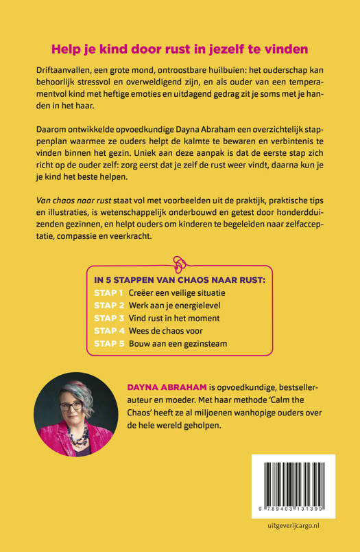 Daarom ontwikkelde opvoedexpert Dayna Abraham een overzichtelijke stap-voor stapaanpak om ouders te helpen een gezin te vormen dat de kalmte weet te bewaren en dat diep verbonden is. Uniek aan deze aanpak is dat de eerste stap zich richt op de ouder zelf: zorg eerst dat je zelf de kalmte weer vindt, daarna kun je je kind het beste helpen.