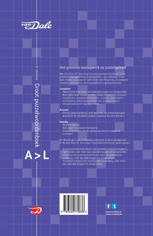 Het Van Dale Dr. Verschuyl Groot puzzelwoordenboek is het grootste naslagwerk op puzzelgebied - een absolute must voor iedere puzzelaar en liefhebber van filippines, kruiswoordraadsels, doorlopers, kennispuzzelsen cryptogrammen!