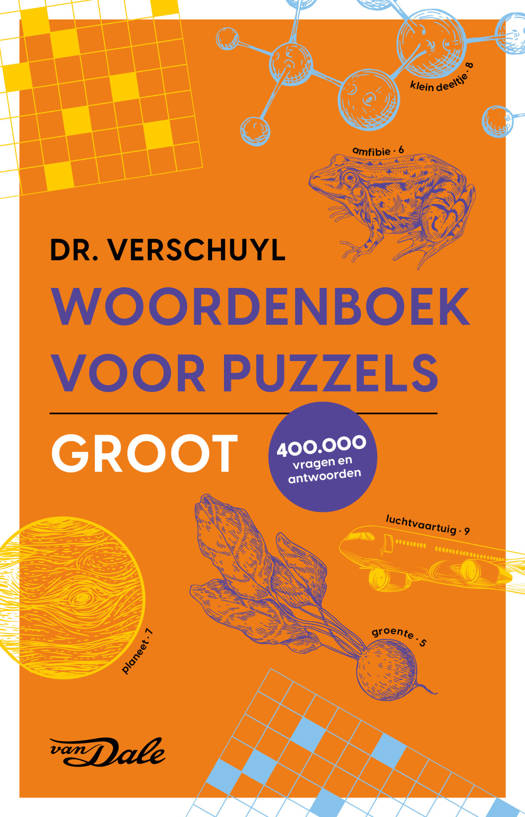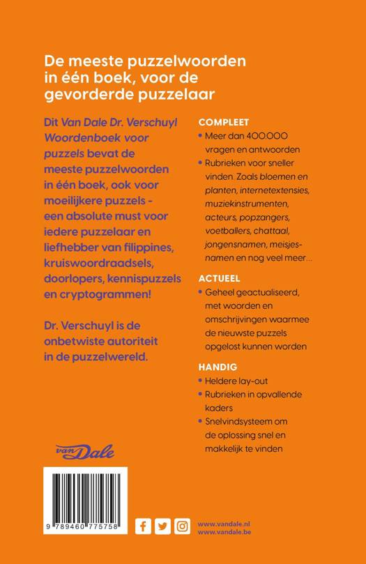 Dit Van Dale Dr. Verschuyl Woordenboek voor puzzels - Groot bevat de meeste puzzelwoorden in één boek, ook voor moeilijkere puzzels - een absolute must voor iedere puzzelaar en liefhebber van filippines, kruiswoordraadsels, doorlopers, kennispuzzels en cryptogrammen! Dr. Verschuyl is de onbetwiste autoriteit in de puzzelwereld.