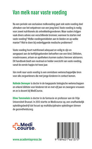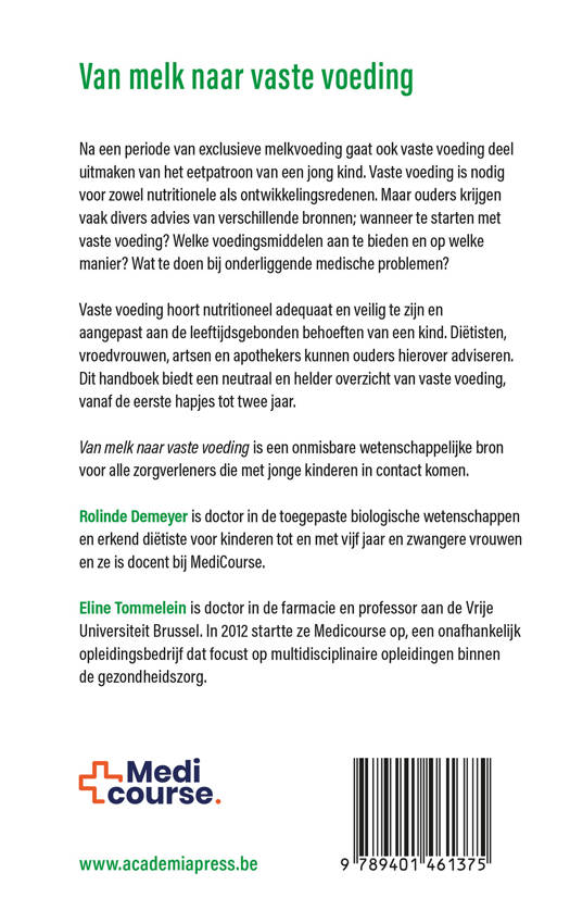 Vaste voeding hoort nutritioneel adequaat en veilig te zijn en aangepast aan de leeftijdsgebonden behoeften van een kind. Diëtisten, vroedvrouwen, artsen en apothekers kunnen ouders hierover adviseren. Dit handboek biedt een neutraal en helder overzicht van vaste voeding, vanaf de eerste hapjes tot twee jaar.