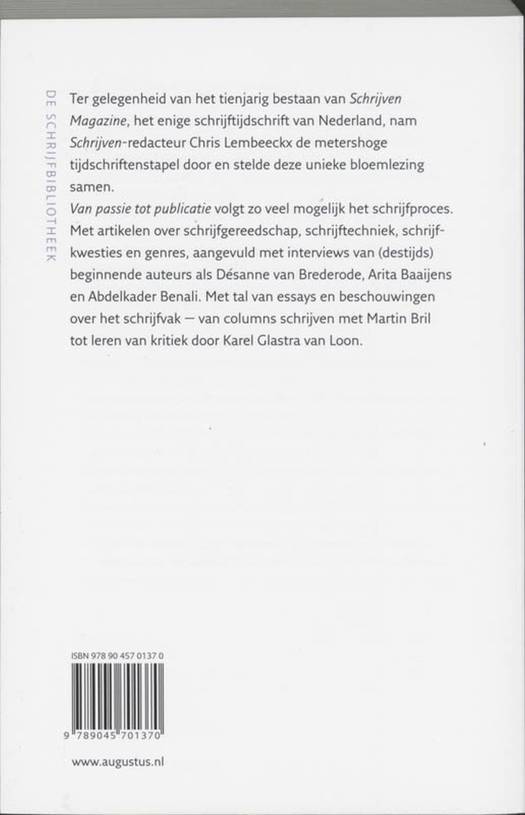 Ter gelegenheid van het 25-jarig bestaan van het enige schrijftijdschrift van Nederland nam Schrijven-redacteur Chris Lembeeckx de metershoge tijdschriftstapel door en stelde een unieke compilatie samen van artikelen over schrijfgereedschap, -techniek, -kwesties en genres, aangevuld met interviews van (destijds) beginnende auteurs als Tommy Wieringa, Désanne van Brederode en Abdelkader Benali. Met tal van essays en beschouwingen over het schrijfvak van columns schrijven met Martin Bril tot leren van kritiek door Karel Glastra van Loon. '
