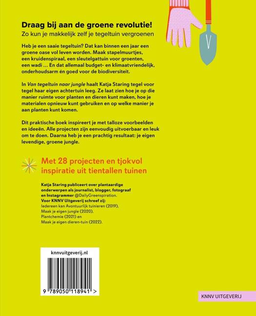 In ‘Van tegeltuin naar jungle’ haalt Katja Staring tegel voor tegel haar eigen achtertuin leeg. Ze laat zien hoe je op die manier ruimte voor planten en dieren kunt maken, hoe je materialen opnieuw kunt gebruiken en op welke manier je aan planten kunt komen.