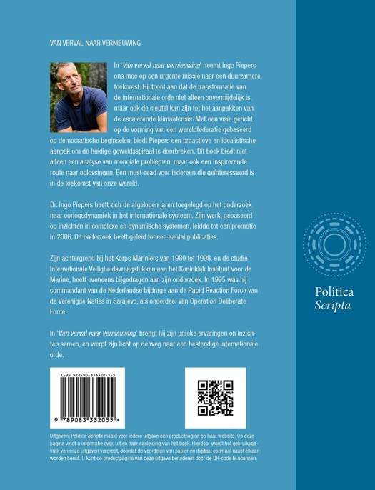 In ‘Van verval naar vernieuwing’ neemt Ingo Piepers ons mee op een urgente missie naar een duurzamere toekomst. Hij toont aan dat de transformatie van de internationale orde niet alleen onvermijdelijk is, maar ook de sleutel kan zijn tot het aanpakken van de escalerende klimaatcrisis. Met een visie gericht op de vorming van een wereldfederatie gebaseerd op democratische beginselen, biedt Piepers een proactieve en idealistische aanpak om de huidige geweldsspiraal te doorbreken. Dit boek biedt niet alleen een analyse van mondiale problemen, maar ook een inspirerende route naar oplossingen. Een must-read voor iedereen die geïnteresseerd is in de toekomst van onze wereld.