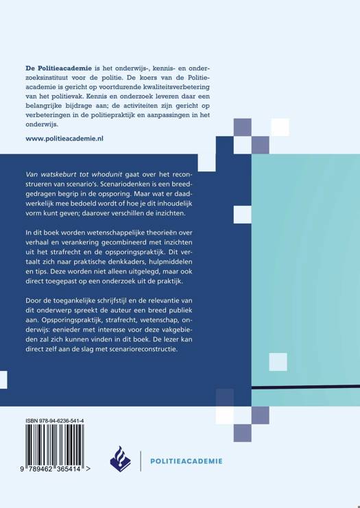 Van watskeburt tot whodunit gaat over het reconstrueren van scenario’s. Scenariodenken is een breedgedragen begrip in de opsporing. Maar wat er daadwerkelijk mee bedoeld wordt of hoe je dit inhoudelijk vorm kunt geven; daarover verschillen de inzichten.