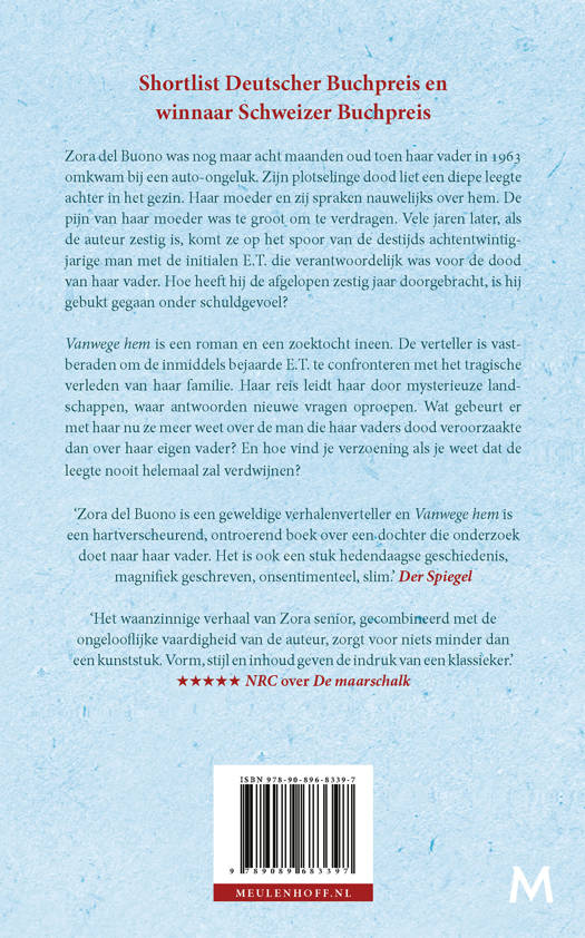 ‘Zora del Buono is een geweldige verhalenverteller en Vanwege hem is een hartverscheurend, ontroerend boek over een dochter die onderzoek doet naar haar vader. Het is ook een stuk hedendaagse geschiedenis, magnifiek geschreven, onsentimenteel, slim. Een boek dat je in één keer uit kunt lezen.’ Der Spiegel