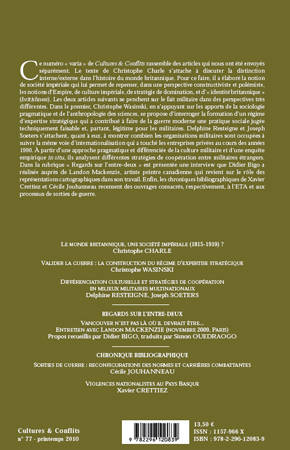 Au sommaire de ce numéro : Le monde britannique, une société impériale (1815-1919) ? / Valider la guerre : la construction du régime d'expertise stratégique / Différenciation culturelle et stratégies de coopération en milieux militaires multinationaux / Vancouver n'est pas là où il devrait être... entretien avec Landon Mackenzie par Didier Bigo.