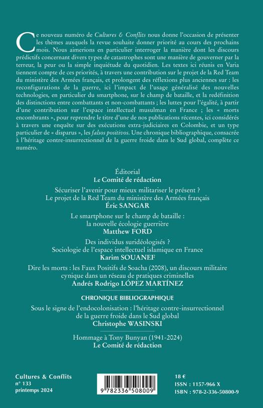 Ce nouveau numéro de Cultures & Conflits nous donne l'occasion de présenter les thèmes auxquels la revue souhaite donner priorité au cours des prochains mois. Nous aimerions en particulier interroger la manière dont les discours prédictifs concernant divers types de catastrophes sont une manière de gouverner par la terreur, la peur ou la simple inquiétude du quotidien. Les textes ici réunis en Varia tiennent compte de ces priorités, à travers une contribution sur le projet de la Red Team du ministère des Armées français, et prolongent des réflexions plus anciennes sur: les reconfigurations de la guerre, ici l'impact de l'usage généralisé des nouvelles technologies, en particulier du smartphone, sur le champ de bataille, et la redéfinition des distinctions entre combattants et non-combattants; les luttes pour l'égalité, à partir d'une contribution sur l'espace intellectuel musulman en France; les morts encombrants, pour reprendre le titre d'une de nos publications récentes, ici considérés à travers une enquête sur des exécutions extra-judiciaires en Colombie, et un type particulier de disparus, les falsos positivos. Une chronique bibliographique, consacrée à l'héritage contre-insurrectionnel de la guerre froide dans le Sud global, complète ce numéro.