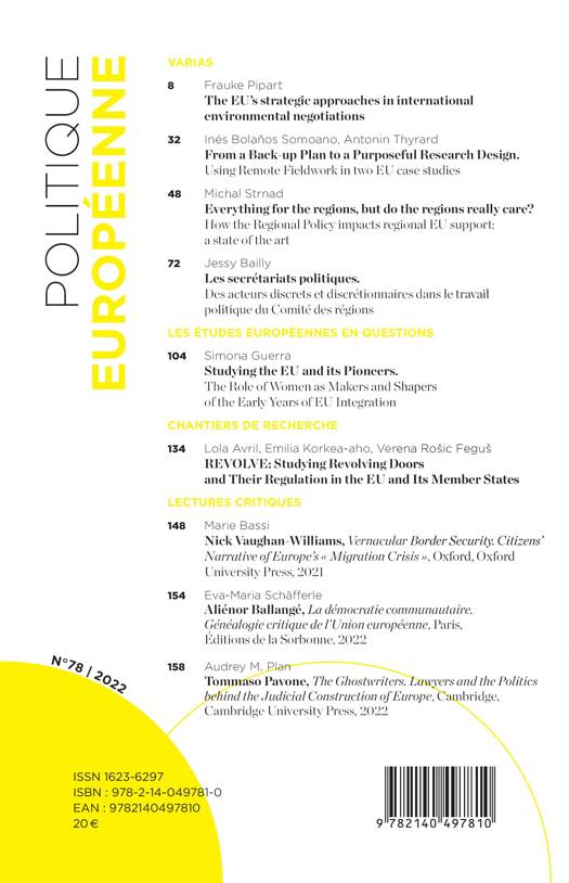 Au sommaire de ce numéro: The EU's strategic approaches in international environmental negotiations / From a Back-up Plan to a Purposeful Research Design. Using Remote Fieldwork in two EU case studies / Everything for the regions, but do the regions really care? How the Regional Policy impacts regional EU support: a state of the art / Les secrétariats politiques. Des acteurs discrets et discrétionnaires dans le travail politique du Comité des régions / Studying the EU and its Pioneers. The Role of Women as Makers and Shapers of the Early Years of EU Integration / REVOLVE: Studying Revolving Doors and Their Regulation in the EU and Its Member States