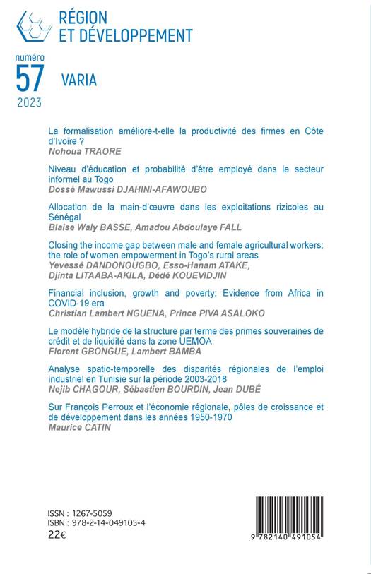 Ce numéro contient: La formalisation améliore-t-elle la productivité des firmes en Côte d'Ivoire ? / Niveau d'éducation et probabilité d'être employé dans le secteur informel au Togo / Allocation de la main d'oeuvre dans les exploitations rizicoles au Sénégal / Closing the income gap between male and female agricultural workers: the role of women empowerment in Togo's rural areas / Financial inclusion, growth and poverty: Evidence from Africa in COVID-19 era / Le modèle hybride de la structure par terme des primes souveraines de crédit et de liquidité dans la zone UEMOA / Analyse spatio-temporelle des disparités régionales de l'emploi industriel en Tunisie sur la période 2003-2018 / Sur François Perroux et l'économie régionale, pôles de croissance et de développement dans les années 1950-1970