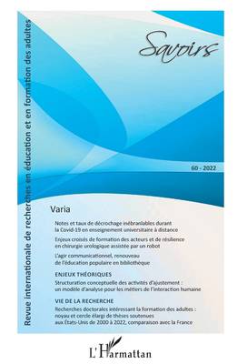 Ce numéro 60 de la revue Savoirs invite nos lecteurs et lectrices à la découverte d'articles s'inscrivant dans un panel large de secteurs touchant à la formation des adultes. Le premier article de recherche intitulé Notes et taux de décrochage inébranlables durant la Covid-19 en enseignement universitaire à distance d'A. Baillifard et C. S. Martarelli étudie l'impact du passage au tout à distance chez des adultes en reprise d'études. La seconde contribution portant sur les Enjeux croisés de formation des acteurs et de résilience en chirurgie urologique assistée par un robot, nous est proposée par J. Lefrançois, C. Vidal-Gomel et E. Olivier. Le troisième texte de T. Balmon s'intéresse à L'agir communicationnel, comme renouveau de l'éducation populaire en bibliothèque . S'appuyant sur la théorie d'Habermas, l'autrice a cherché à identifier le moteur éducatif commun aux différentes actions proposées en bibliothèque de lecture publique.