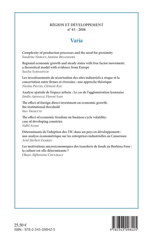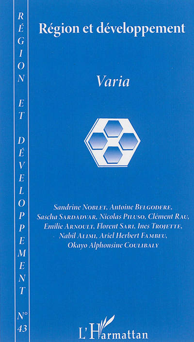 Ce numéro de la revue Région et Développement rassemble huit articles, en français et en anglais : "Les investissements de sécurisation des sites industriels à risque et la concertation entre firmes et riverains : une approche théorique" ; "Analyse spatiale de l'espace urbain : le cas de l'agglomération lyonnaise" ; "The effect of foreign direct investment on economic growth : the institutional treshold" et "The effect of economic freedom on business cycle volatility : case of developping countries".