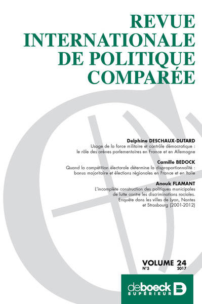 Delphine DESCHAUX-DUTARD : Usage de la force militaire et contrôle démocratique : le rôle des arènes parlementaires en France et en Allemagne // Camille BEDOCK : Quand la compétition électorale détermine la disproportionnalité : bonus majoritaire et élections régionales en France et en Italie // Anouk FLAMANT : L’incomplète construction des politiques municipales de lutte contre les discriminations raciales. Enquête dans les villes de Lyon, Nantes et Strasbourg (2001-2012) //
