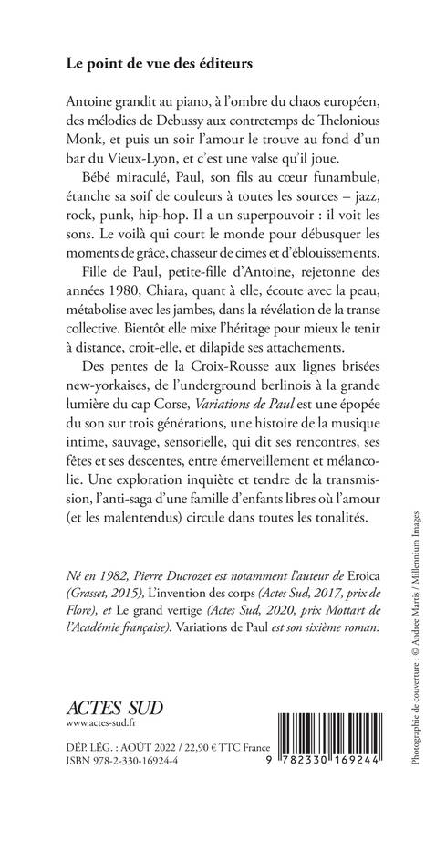 Antoine grandit au piano, à l'ombre du chaos européen, des mélodies de Debussy aux contretemps de Thelonious Monk, et puis un soir l'amour le trouve au fond d'un bar du Vieux-Lyon, et c'est une valse qu'il joue. Bébé miraculé, Paul, son fils au coeur funambule, étanche sa soif de couleurs à toutes les sources - jazz, rock, punk, hip-hop. Il a un superpouvoir : il voit les sons. Le voilà qui court le monde pour débusquer les moments de grâce, chasseur de cimes et d'éblouissements. Fille de Paul, petite-fille d'Antoine, rejetonne des années 1980, Chiara, quant à elle, écoute avec la peau, métabolise avec les jambes, dans la révélation de la transe collective. Bientôt elle mixe l'héritage pour mieux le tenir à distance, croit-elle, et dilapide ses attachements. Des pentes de la Croix-Rousse aux lignes brisées new-yorkaises, de l'underground berlinois à la grande lumière du cap Corse, "Variations de Paul" est une épopée du son sur trois générations, une histoire de la musique intime, sauvage, sensorielle, qui dit ses rencontres, ses fêtes et ses descentes, entre émerveillement et mélancolie. Une exploration inquiète et tendre de la transmission, l'anti-saga d'une famille d'enfants libres où l'amour (et les malentendus) circule dans toutes les tonalités.