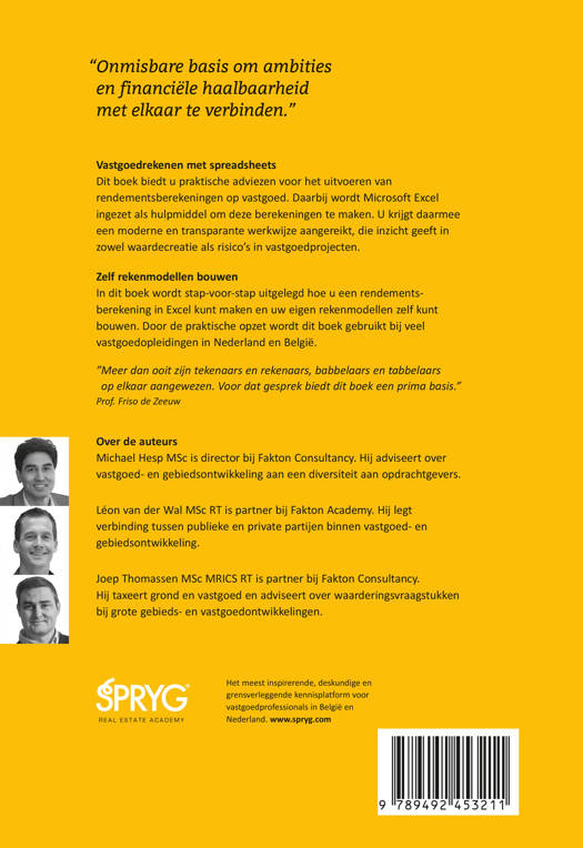 Vastgoedrekenen met spreadsheets Dit boek biedt u praktische adviezen voor het uitvoeren van rendementsberekeningen op vastgoed. Daarbij wordt Microsoft Excel ingezet als hulpmiddel om deze berekeningen te maken. U krijgt daarmee een moderne en transparante werkwijze aangereikt, die inzicht geeft in zowel waardecreatie als risico’s in vastgoedprojecten.