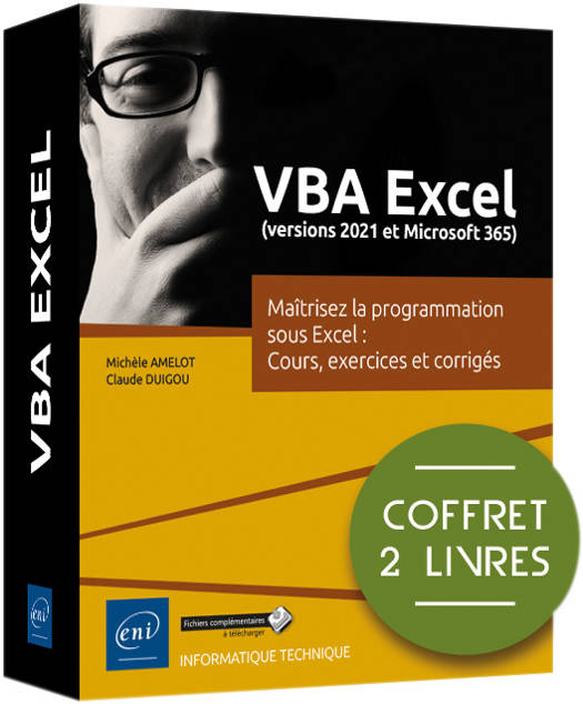 Ces deux livres offrent au lecteur un maximum d’informations sur la programmation sous Excel (en version 2021 ou Microsoft 365) à l'aide du langage VBA et des macros pour développer des applications professionnelles. 901 pages par nos experts. Des éléments complémentaires sont en téléchargement sur le site www.editions-eni.fr.