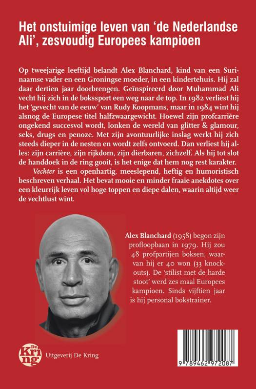 Het bewogen leven van 'de Nederlandse Ali', zesvoudig Europees kampioen ***** Op tweejarige leeftijd belandt Alex Blanchard, kind van een Surinaamse vader en een Groningse moeder, in een kindertehuis. Hij zal daar dertien jaar doorbrengen. Geïnspireerd door Muhammad Ali vecht hij zich in de bokssport een weg naar de top. In 1982 verliest hij het 'gevecht van de eeuw' van Rudy Koopmans, maar in 1984 wint hij alsnog de Europese titel halfzwaargewicht. Hoewel zijn profcarrière ongekend succesvol wordt, lonken de wereld van glitter & glamour, seks, drugs en penoze. Met zijn avontuurlijke inslag werkt hij zich steeds dieper in de nesten en wordt zelfs ontvoerd. Dan verliest hij alles: zijn carrière, zijn rijkdom, zijn dierbaren, zichzelf. Als hij tot slot de handdoek in de ring gooit, is het enige dat hem nog rest karakter. VECHTER is een openhartig, meeslepend, heftig en humoristisch beschreven verhaal. Het bevat mooie en minder fraaie anekdotes over een kleurrijk leven vol hoge toppen en diepe dalen, waarin altijd weer de vechtlust wint.