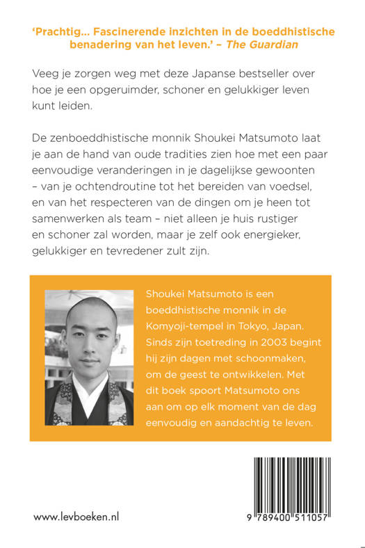 In Japan staat reinheid direct naast verlichting. De zenboeddhistische monnik Shoukei Matsumoto laat je aan de hand van oude tradities zien hoe met een paar eenvoudige veranderingen in je dagelijkse gewoonten – van je ochtendroutine tot het bereiden van voedsel, en van het respecteren van de dingen om je heen tot samenwerken als team – niet alleen je huis rustiger en schoner zal worden, maar je zelf ook energieker, gelukkiger en tevredener zult zijn.