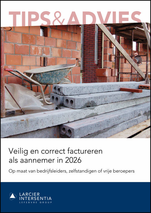 Dit Tips & Advies-Boek geeft u als aannemer een antwoord op al uw facturatievragen. We wijzen u specifiek op aangepaste en nieuwe regels. Aan de hand van 15 thema's bieden we u oplossingen voor al uw facturatiemiserie: