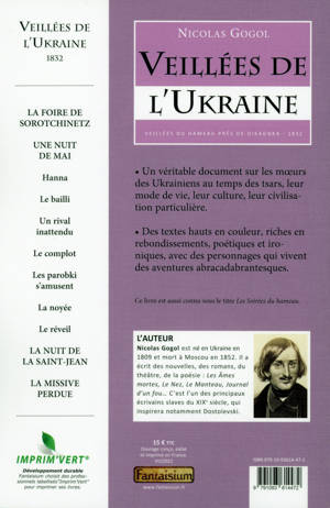 Nicolas Gogol, le grand écrivain d’origine ukrainienne, nous raconte des histoires à la fois drôles et surréalistes. Elles témoignent de la vie des petites gens en Ukraine du temps des tsars et des guerriers cosaques. Écrites entre 1830 et 1843, ces nouvelles ont été les premières créations importantes de Nicolas Gogol, et ont lancé sa carrière de romancier. La traduction est d’E. Halpérine-Kaminsky (1890). Un véritable document sur les moeurs des Ukrainiens d’avant l’époque communiste, leur mode de vie, leur culture particulière. Des textes hauts en couleur, drôles et poétiques, avec des personnages truculents qui vivent des aventures abracadabrantesques. Des histoires qui aident à mieux comprendre “l’âme slave” et l’Ukraine d’aujourd’hui.