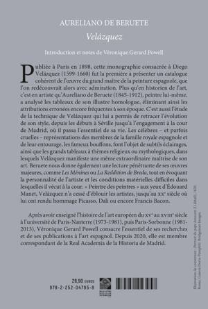 Publiee a Paris en 1898, cette monographie consacree a Diego Velazquez (1599-1660) fut la premiere a presenter un catalogue coherent de l'oeuvre du grand maitre de la peinture espagnole, que l'on redecouvrait alors avec admiration. Plus qu'en historien de l'art, c'est en artiste qu'Aureliano de Beruete (1845-1912), peintre lui-meme, a analyse les tableaux de son illustre homologue, eliminant ainsi les attributions erronees encore frequentes a son epoque. C'est aussi l'etude de la technique de Velazquez qui lui a permis de retracer l'evolution de son style, depuis les debuts a Seville jusqu'a l'engagement a la cour de Madrid, ou il passa l'essentiel de sa vie. Les celebres - et parfois cruelles - representations des membres de la famille royale espagnole et de leur entourage, les fameux bouffons, font l'objet de subtils eclairages, ainsi que les grands tableaux a themes religieux ou mythologiques, dans lesquels Velazquez manifeste une meme extraordinaire maitrise de son art. Beruete nous donne egalement une lecture penetrante de ses oeuvres majeures, comme Les Menines ou La Reddition de Breda, tout en evoquant la personnalite de l'artiste et les conditions materielles difficiles dans lesquelles il vecut a la cour. Peintre des peintres aux yeux d'Edouard Manet, Velazquez n'a cesse d'eblouir les artistes, jusqu'au xxe siecle ou lui ont rendu hommage Picasso, Dali ou encore Francis Bacon.