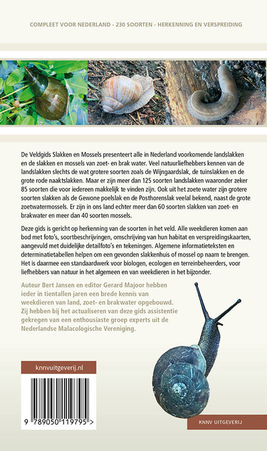 Deze geheel hernieuwde 'Veldgids Land- en zoetwatermollusken' bevat determinatiehulp voor alle 124 soorten landslakken en 106 zoetwaterslakken en mossels in Nederland. Iedere weekdiersoort komt aan bod met foto’s, een soortbeschrijving, omschrijving van de habitat en een verspreidingskaart, aangevuld met duidelijke detailfoto’s en tekeningen. Algemene informatieteksten en determinatietabellen helpen om een gevonden slak, slakkenhuis of mossel op naam te brengen.