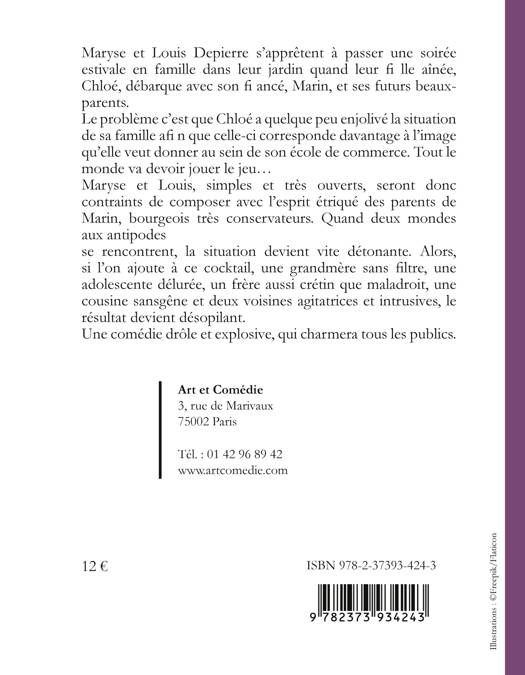 Maryse et Louis Depierre s'apprêtent à passer une soirée estivale en famille dans leur jardin quand leur fi lle aînée, Chloé, débarque avec son fi ancé, Marin, et ses futurs beaux-parents. Le problème c'est que Chloé a quelque peu enjolivé la situation de sa famille afi n que celle-ci corresponde davantage à l'image qu'elle veut donner au sein de son école de commerce. Tout le monde va devoir jouer le jeu... Maryse et Louis, simples et très ouverts, seront donc contraints de composer avec l'esprit étriqué des parents de Marin, bourgeois très conservateurs. Quand deux mondes aux antipodes se rencontrent, la situation devient vite détonante. Alors, si l'on ajoute à ce cocktail, une grandmère sans filtre, une adolescente délurée, un frère aussi crétin que maladroit, une cousine sansgêne et deux voisines agitatrices et intrusives, le résultat devient désopilant. Une comédie drôle et explosive, qui charmera tous les publics