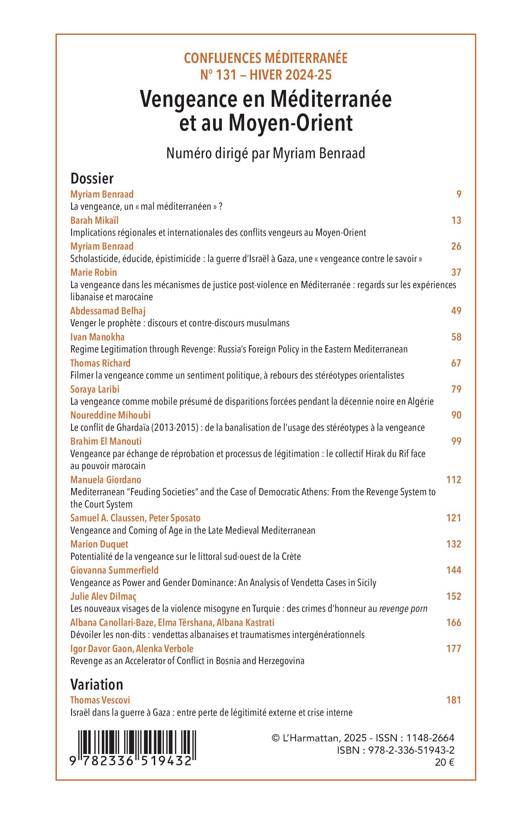 Sommaire: La vengeance, un mal méditerranéen; Implications régionales et internationales des conflits vengeurs au Moyen-Orient; Scholasticide, éducide, épistimicide: la guerre d'Israël à Gaza, une vengeance contre le savoir; La vengeance dans les mécanismes de justice post-violence en Méditerranée: regards sur les expériences libanaise et marocaine; Venger le prophète: discours et contre-discours musulmans; Regime Legitimation through Revenge: Russia's Foreign Policy in the Eastern Mediterranean; Filmer la vengeance comme un sentiment politique, à rebours des stéréotypes orientalistes; La vengeance comme mobile présumé de disparitions forcées pendant la décennie noire en Algérie; Le conflit de Ghardaïa (2013-2015): de la banalisation de l'usage des stéréotypes à la vengeance; Vengeance par échange de réprobation et processus de légitimation: le collectif Hirak du Rif face au pouvoir marocain; Mediterranean "Feuding Societies" and the Case of Democratic Athens: From the Revenge System to the Court System; Vengeance and Coming of Age in the Late Medieval Mediterranean; Potentialité de la vengeance sur le littoral sud-ouest de la Crète; Vengeance as Power and Gender Dominance: An Analysis of Vendetta Cases in Sicily; Les nouveaux visages de la violence misogyne en Turquie: des crimes d'honneur au revenge porn; Dévoiler les non-dits: vendettas albanaises et traumatismes intergénérationnels; Revenge as an Accelerator of Conflict in Bosnia and Herzegovina; Israël dans la guerre à Gaza: entre perte de légitimité externe et crise interne