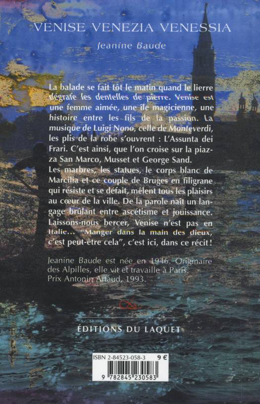 La balade se fait tôt le matin quand le lierre dégrafe les dentelles de pierre. Venise est une femme aimée, une île magicienne, une histoire entre les fils de la passion. La musique de Luigi Nono, celle de Monteverdi, les plis de la robe s'ouvrent : L'Assunta dei Frari. C'est ainsi, que l'on croise sur la piazza San Marco, Musset et George Sand.