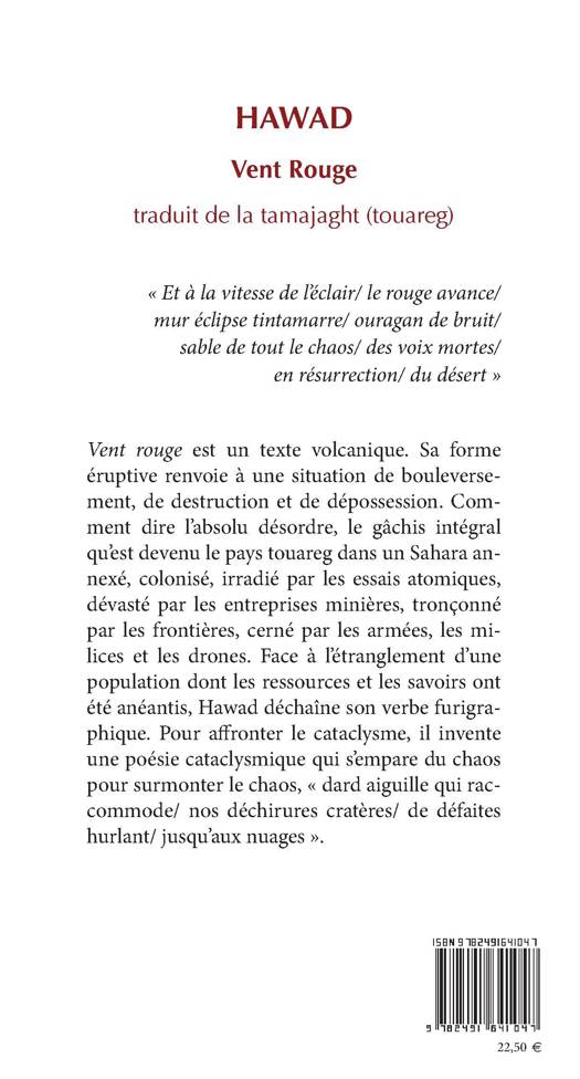 Vent Rouge est un texte volcanique. Sa forme éruptive renvoie à une situation de bouleversement, de destruction et de dépossession. Comment dire l’absolu désordre, le gâchis intégral qu’est devenu le pays touareg dans un Sahara annexé, colonisé, irradié par les essais atomiques, dévasté par les entreprises minières, tronçonné par les frontières, cerné par les armées, les milices et les drones ? Face à l’étranglement d’une population dont les ressources et les savoirs ont été anéantis, Hawad déchaîne son verbe furigraphique. Pour affronter le cataclysme, il invente une poésie cataclysmique qui s’empare du chaos pour surmonter le chaos, « dard aiguille qui accommode/nos déchirures cratères/ de défaites hurlant/ jusqu’aux nuages ».