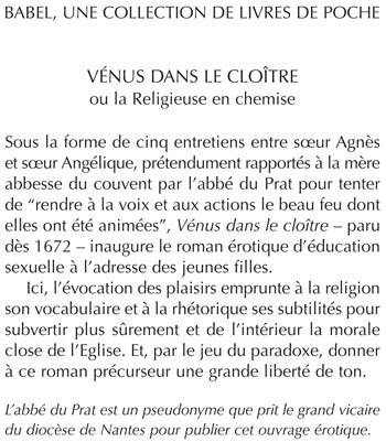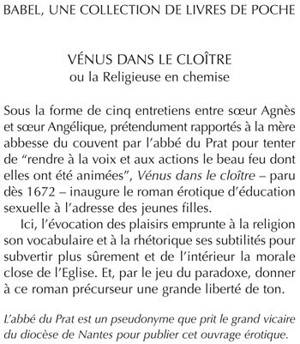 Sous la forme de cinq entretiens entre soeur Agnès et soeur Angélique, prétendument rapportés à la mère abbesse du couvent par l'abbé du Prat pour tenter de "rendre à la voix et aux actions le beau feu dont elles ont été animées", Vénus dans le cloître - paru dès 1672 - inaugure le roman érotique d'éducation sexuelle à l'adresse des jeunes filles. Ici, l'évocation des plaisirs emprunte à la religion son vocabulaire et à la rhétorique ses subtilités pour subvertir plus sûrement et de l'intérieur la morale close de l'Eglise. Et, par le jeu du paradoxe, donner à ce roman précurseur une grande liberté de ton.