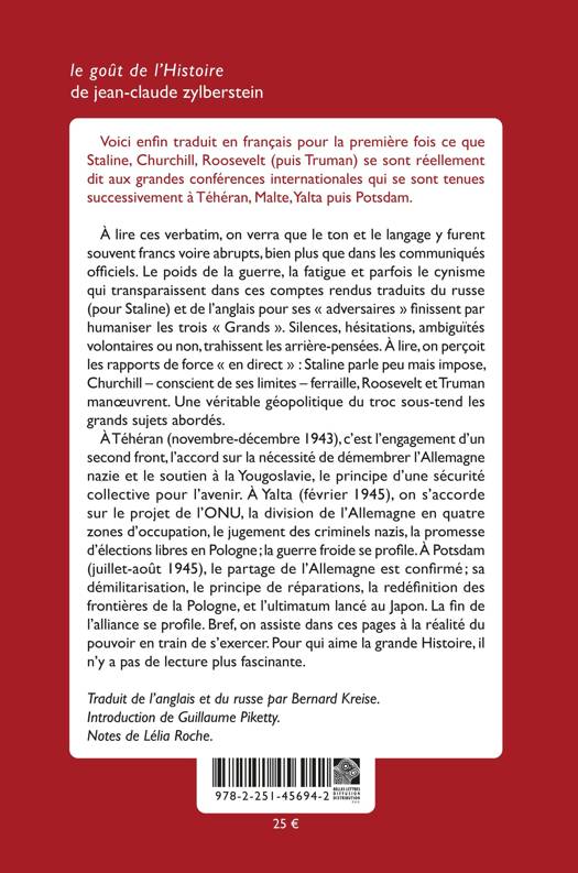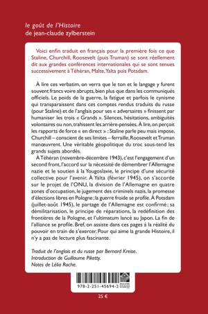 Voici enfin traduit en français pour la première fois ce que Staline, Churchill, Roosevelt (puis Truman) se sont réellement dit aux grandes conférences internationales qui se sont tenues successivement à Téhéran, Malte, Yalta puis Potsdam.