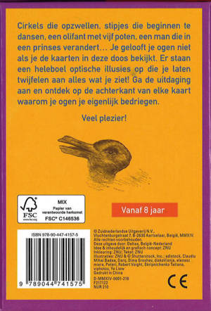 Cirkels die opzwellen, stipjes die beginnen te dansen, een olifant met vijf poten, een man die in een prinses verandert... Je gelooft je eigen ogen niet als je de kaarten in deze doos bekijkt. Er staan een heleboel optische illusies op die je laten twijfelen aan alles wat je ziet! Ga de uitdaging aan en ontdek op de achterkant van elke kaart waarom je ogen je eigenlijk bedriegen.