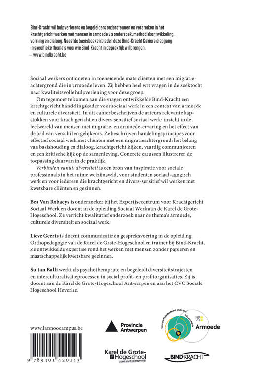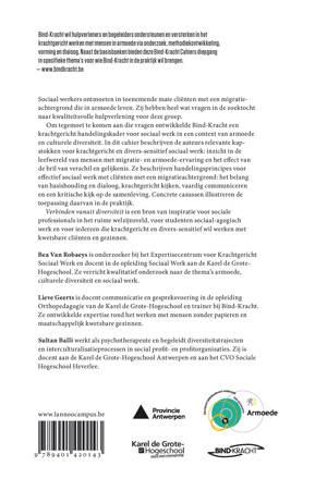 Een genuanceerde en gedurfde visie op hulpverlening aan cliënten in armoede met een migratie-achtergrond Sociaal werkers ontmoeten in toenemende mate cliënten met een migratieachtergrond die in armoede leven. Zij hebben heel wat vragen in de zoektocht naar kwaliteitsvolle hulpverlening voor deze groep. Om tegemoet te komen aan die vragen ontwikkelde Bind-Kracht een kracht gericht handelingskader voor sociaal werk in een context van armoede en culturele diversiteit. In dit cahier beschrijven de auteurs relevante kapstokken voor kracht gericht en divers-sensitief sociaal werk: inzicht in de leefwereld van mensen met migratie- en armoede-ervaring en het effect van de bril van verschil en gelijkenis. Ze beschrijven handelingsprincipes voor effectief sociaal werk met cliënten met een migratieachtergrond: het belang van basishouding en dialoog, krachtgericht kijken, vaardig communiceren en een kritische kijk op de samenleving. Concrete casussen illustreren de toepassing daarvan in de praktijk. Verbinden vanuit diversiteit is een bron van inspiratie voor sociale professionals in het ruime welzijnsveld, voor studenten sociaal-agogisch werk en voor iedereen die krachtgericht en divers-sensitief wil werken met kwetsbare cliënten en gezinnen.