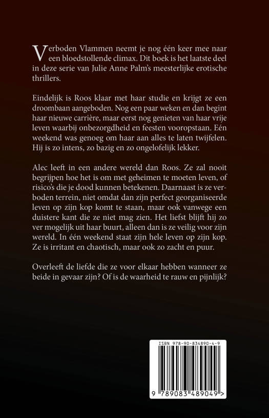 Verboden Vlammen neemt je nog één keer mee naar een bloedstollende climax. Dit boek is het laatste deel in deze serie van Julie Anne Palm’s meesterlijke erotische thrillers.