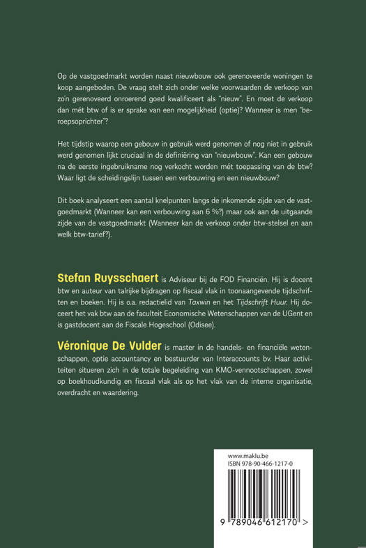 Dit boek analyseert een aantal knelpunten langs de inkomende zijde van de vastgoedmarkt (Wanneer kan een verbouwing aan 6 %?) maar ook aan de uitgaande zijde van de vastgoedmarkt (Wanneer kan de verkoop onder btw-stelsel en aan welk btw-tarief?)