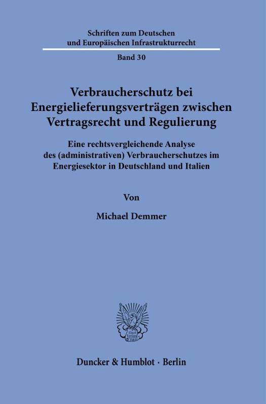 English summary: Consumer Protection with Regard to Energy Supply Contracts between Contract Law and Regulation. A Comparative Legal Analysis of (Administrative) Consumer Protection in the Energy Sector in Germany and Italy The author analyses (administrative) consumer protection in energy supply contracts and examines the extent to which the administration in Italy and Germany can theoretically and actually act to protect consumers in the energy sector. While Italian law is based on standard enforcement by the authorities, German law primarily pursues a civil law approach, with both countries granting their regulatory authorities extensive powers. German description: Auf Basis einer rechtsvergleichenden Untersuchung des deutschen und italienischen, insbesondere administrativen Verbraucherschutzes im Energiesektor, wird der Verbraucherschutz im Rahmen von Energielieferungsvertragen zwischen Vertragsrecht und Regulierung analysiert. Der Autor geht hierbei der Frage nach, inwieweit die Verwaltung in Italien und Deutschland im Energiesektor theoretisch und tatsachlich im Sinne des Verbrauchers und zu seinem Schutz agieren kann. Das italienische Recht geht dabei von der offentlich-rechtlichen Standarddurchsetzung als Normalfall aus, wohingegen im deutschen Lauterkeitsrecht die zivilrechtliche Durchsetzung den Regelfall darstellt. Jenseits des Lauterkeitsrechts und innerhalb des sektorspezifischen Energieverbraucherrechts sind in Italien wie in Deutschland den nationalen Regulierungsbehorden weitreichende Durchsetzungsbefugnisse eingeraumt, die Abgrenzungsfragen zwischen den verschiedenen Durchsetzungssystemen aufwerfen.