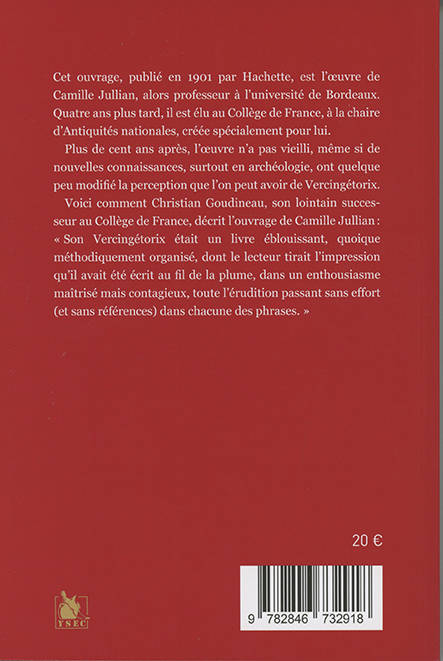 Cet ouvrage, publié en 1901 par Hachette, est l’oeuvre de Camille Jullian, alors professeur à l’université de Bordeaux. Quatre ans plus tard, il est élu au Collège de France, à la chaire d’Antiquités nationales, créée spécialement pour lui. Plus de cent ans après, l’oeuvre n’a pas vieilli, même si de nouvelles connaissances, surtout en archéologie, ont quelque peu modifié la perception que l’on peut avoir de Vercingétorix. Voici comment Christian Goudineau, son lointain successeur au Collège de France, décrit l’ouvrage de Camille Jullianâ: «â¯Son Vercingétorix était un livre éblouissant, quoique méthodiquement organisé, dont le lecteur tirait l’impression qu’il avait été écrit au fil de la plume, dans un enthousiasme maîtrisé mais contagieux, toute l’érudition passant sans effort (et sans références) dans chacune des phrases.⯻