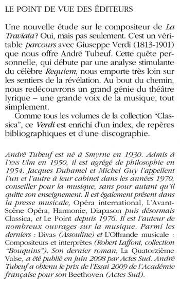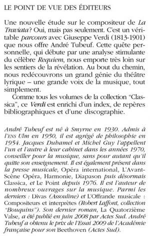 Une nouvelle étude sur le compositeur de La Traviata ? Oui, mais pas seulement. C'est un véri - table parcours avec Giuseppe Verdi (1813-1901) que nous offre André Tubeuf. Cette quête per - son nelle, qui débute par une analyse stimulante du célèbre Requiem, nous emporte très loin sur les sentiers de la révélation. Au bout du chemin, nous redécouvrons un grand génie du théâtre lyrique - une grande voix de la musique, tout simplement. Comme tous les volumes de la collection "Classica", ce Verdi est enrichi d'un index, de re pères bibliographiques et d'une discographie.